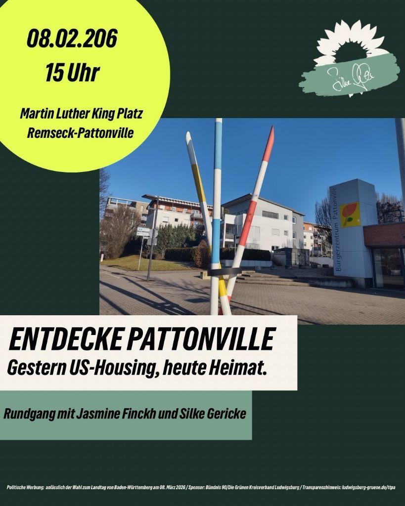 Gemeinsam mit Jasmine Finckh und Silke Gerike (unsere Kandidatin für den Landtag) entdecken wir am 8. Februar 2026 um 15:00 Uhr den Stadtteil Pattonville in Remseck, seine Geschichte, seine Besonderheiten und aktuelle Entwicklungen. Wir treffen uns am Martin Luther King Platz.